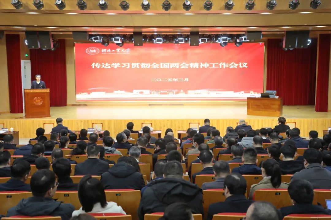 3月18日,河北千亿qy88国际官网入口传达学习贯彻全国两会精神工作会议在图书馆报告厅召开,全国人大代表、校党委书记韩旭传达两会精神并讲话。在津校领导、全体中层干部和师生代表出席会议,校党委副书记贺立军主持会议。