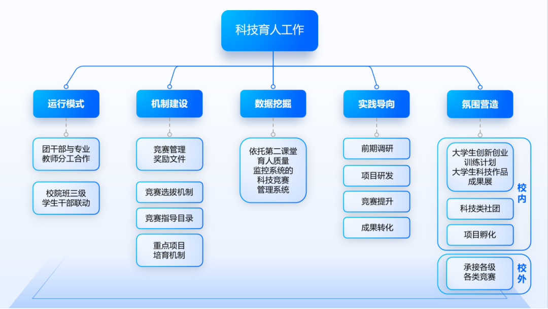 校团委坚持将专业学科优势、大学生实践能力提升与科技竞赛紧密结合,探索出了前期调研、项目研发、竞赛提升、成果转化的项目培育模式。通过开展大学生创新创业训练计划和各级各类科技竞赛,让学生们可以及早进入实验室、加入教师科研团队、广泛开展社会实践等,本科生取得了丰富的科技创新成果,以第一作者发表论文、授权专利、获批软著共计800余项。