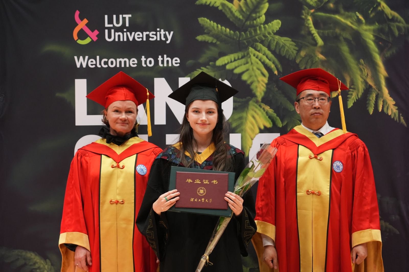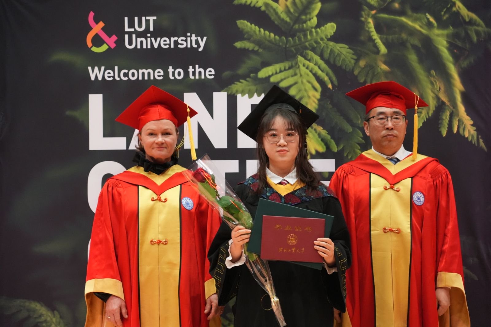 JAANASANDSTR?M发表致辞。她高度评价了芬兰校区的办学成果,认为双方的合作模式在全球高等教育合作中具有重要的示范意义;特别赞扬了两校教职工在合作过程中展现出的开拓创新精神,并对他们为两校所作出的贡献表示衷心感谢。JAANA寄语毕业生,期望他们在未来的生活中始终保持好奇心与独立思考的科学精神,勇于探索、敢于创新,不盲从、不止步,勇敢走出属于自己的道路;能够将所学付诸实践,为推动人类福祉和全球可持续发展贡献智慧与力量;诚挚邀请毕业生加入LUT全球校友网络,继续与母校保持联系,无论身在何方,始终心系LUT,共同迎接更加美好的未来。