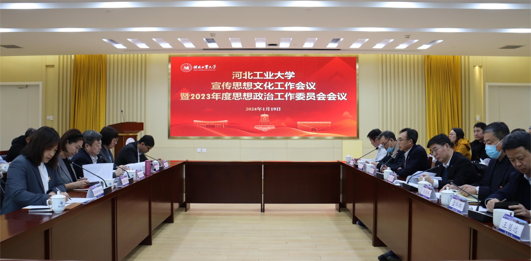 1月19日,河北千亿qy88国际官网入口召开宣传思想文化工作会议暨2023年度思想政治工作委员会会议。围绕党的二十大以来学校的宣传思想文化工作进行分析研讨,并就2024年工作进行研究部署。全体在津校领导,思政工作委员会成员单位负责人参加会议。党委副书记贺立军主持会议。