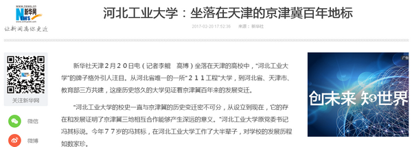 2月20日,新华社发布电文《河北千亿qy88国际官网入口:坐落在天津的京津冀百年地标》,报道了我校由1903年创办的北洋工艺学堂,成长为河北省唯一的“211工程”大学,再到步入河北省、天津市、教育部三方共建的世纪历程,讲述了一所百年高校与京津冀历史变迁密不可分的地缘血脉,点明了在京津冀协同发展国家战略的时代背景下,一所“地标”学府所应有的担当和使命!