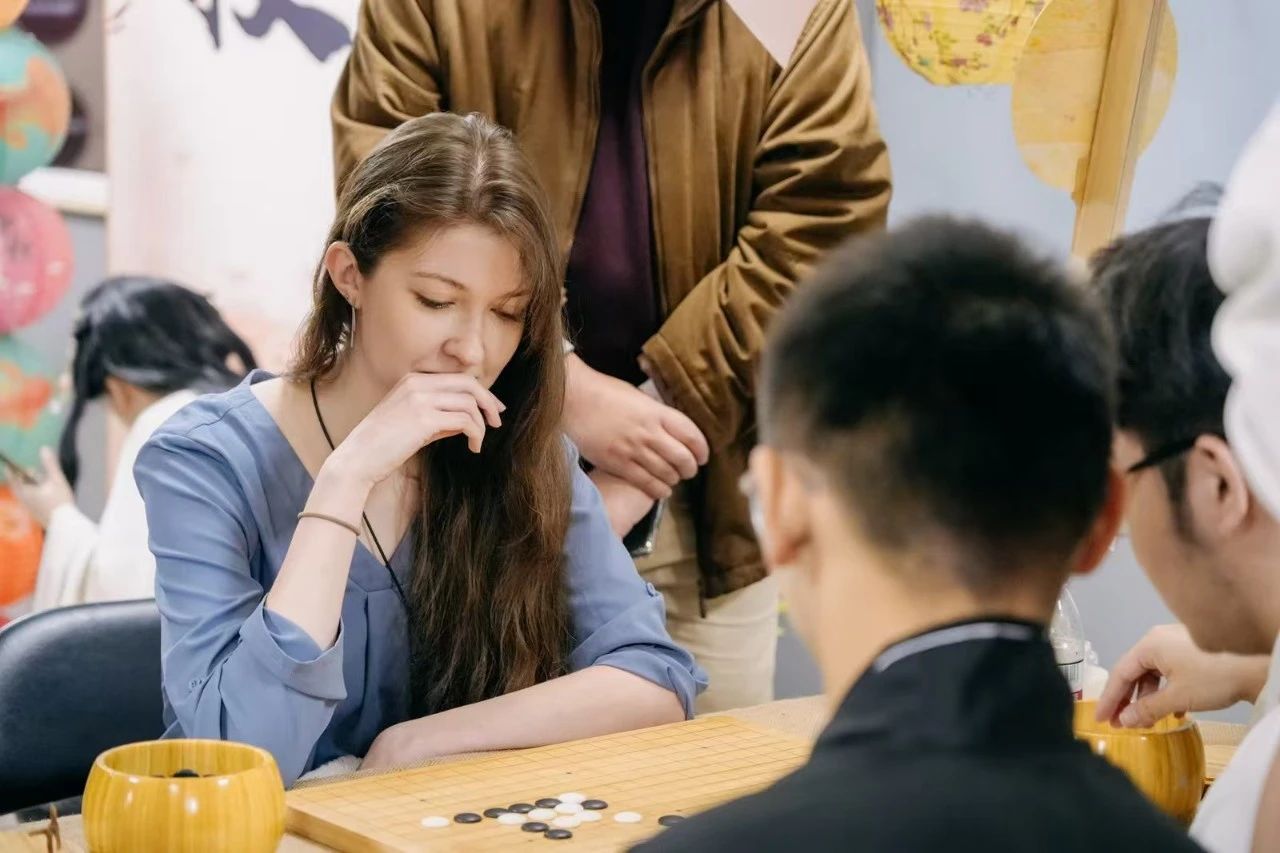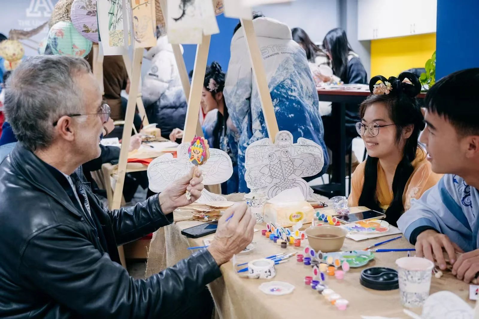 联欢会后,亚利桑那大学一行还参与了国风市集活动。国风市集围绕“琴棋书画”四大主题元素,设置了拍照打卡区、围棋比赛区、书法区、国画(纸鸢)创作区等,其中非遗漆扇制作、非遗扎染、糖画、手工香囊等传统手工艺展示区前吸引了许多师生驻足,亲自参与制作。