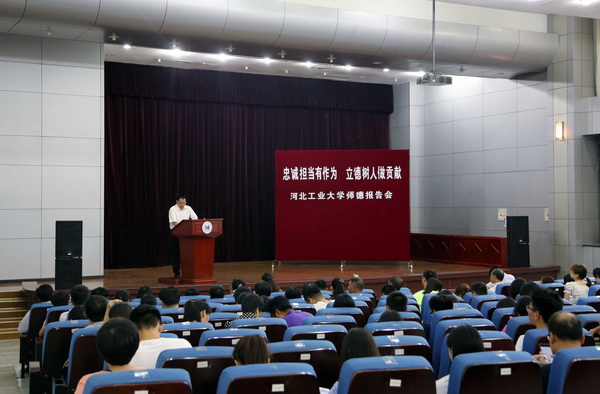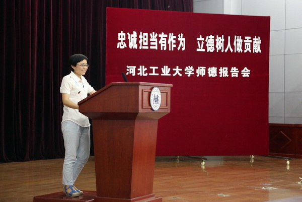 6月9日,由校工会、人事处、宣传部主办的“忠诚担当有作为、立德树立做贡献”师德报告会在行政楼一楼报告厅举行。校党委常委杨玉桢、校各职能部门及各学院负责同志出席。李春利、邢成芬、王秀娟、刘征和张丽红等五位老师从科研、教学、管理服务等方面,结合工作实践和切身感悟,诠释了什么是师德,什么是工大精神。报告会由兼职副主席张紫辉主持。