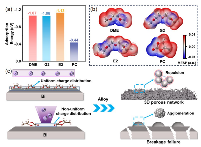 由于资源丰富、成本低廉以及潜在的高能量密度等优势,钠/钾金属(离子)电池在电化学储能领域极具发展潜力。电解液是二次电池的重要组成之一,直接决定了电池的输出电压、循环寿命、安全性能以及离子扩散动力学。醚类电解液因具有与电极材料良好的兼容性而被广泛研究。然而,现有醚类电解液的电化学稳定性不足(< 4.0 V),在充电过程中会先于电极发生氧化反应而分解,无法满足电极在高电压(> 4.0 V)下的工作需求,从而限制电极的容量。同时,缓慢的扩散动力学也会导致Na+/K+由电解液/负极界面向负极内部扩散受阻,易在负极表面生成钠/钾枝晶,带来安全隐患。此外,醚类电解液对电极微观结构的影响也缺乏深入研究。针对上述问题,层状材料与器件团队雷凯翔副教授与团队成员博士后眭思密和硕士研究生李嘉欣等人利用稀释剂或共溶剂参与溶剂化结构的策略构筑阴离子衍生的电极/电解液界面膜(EEI)来提升电解液的氧化稳定性并抑制枝晶生长,同时探究了电解液中有机溶剂的电荷分布以及溶剂与盐阴离子的官能团对电极微观结构的影响。