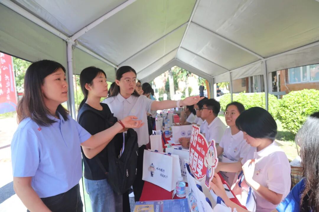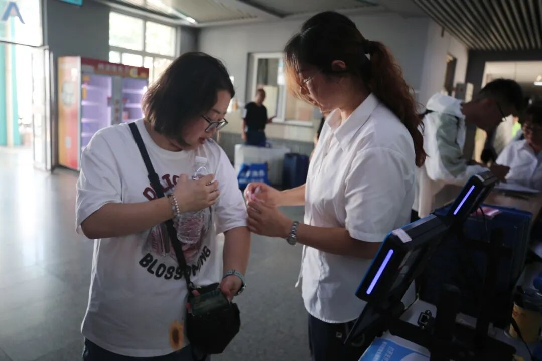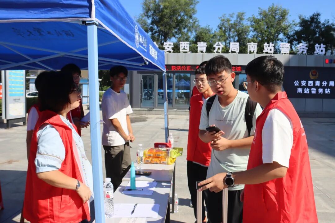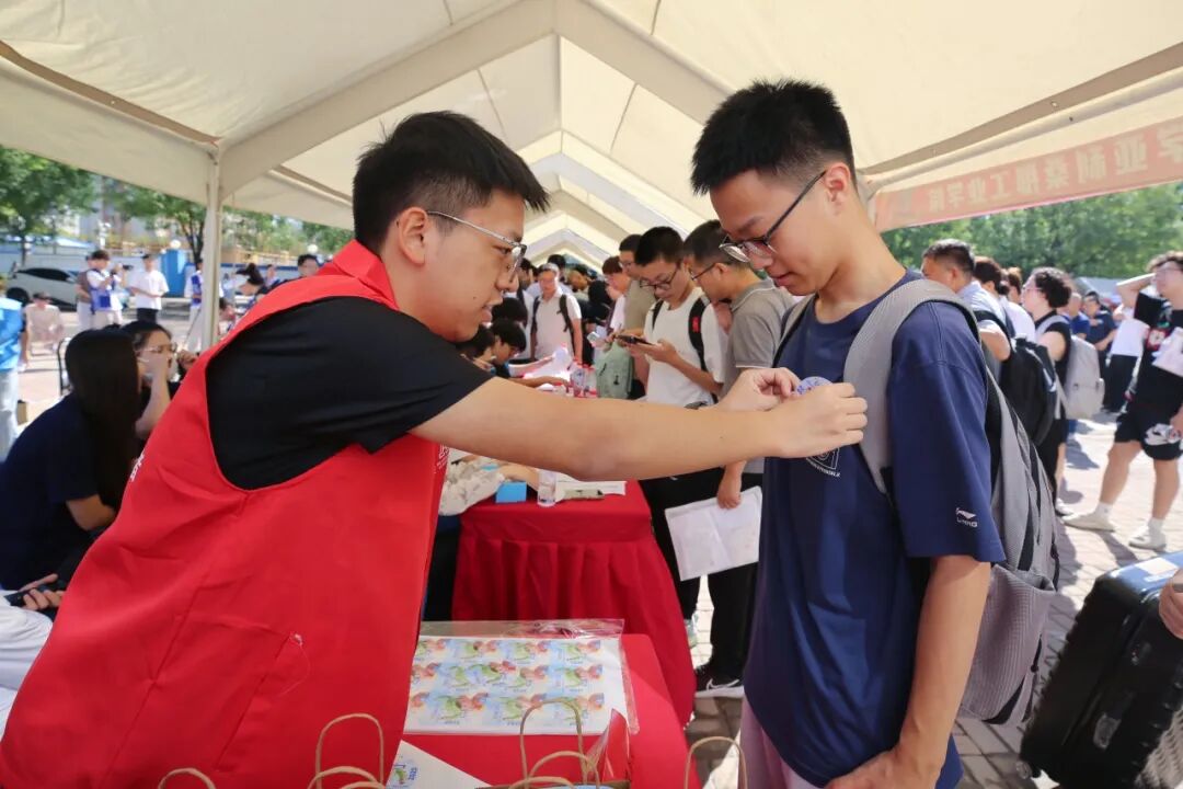 校门口,热情的志愿者接过行李,递上指南。学长学姐在身边微笑引路,为营造温馨、迅速的入校环境。各个学院提前规划了迎新点位,迎新志愿者细讲须知。