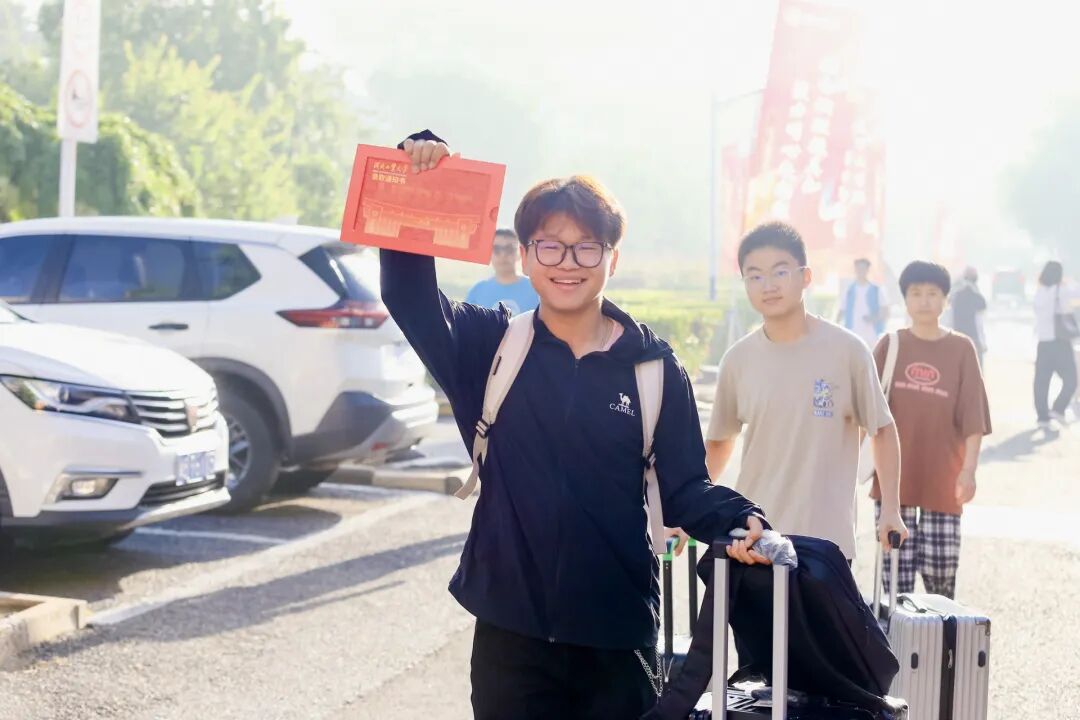 举着手机拍照留念,有的还抱着学校送的迎新小礼物,定格开学第一天!