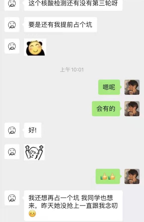 “这个核酸检测还有没有第三轮呀?要是还有我提前占个坑。”