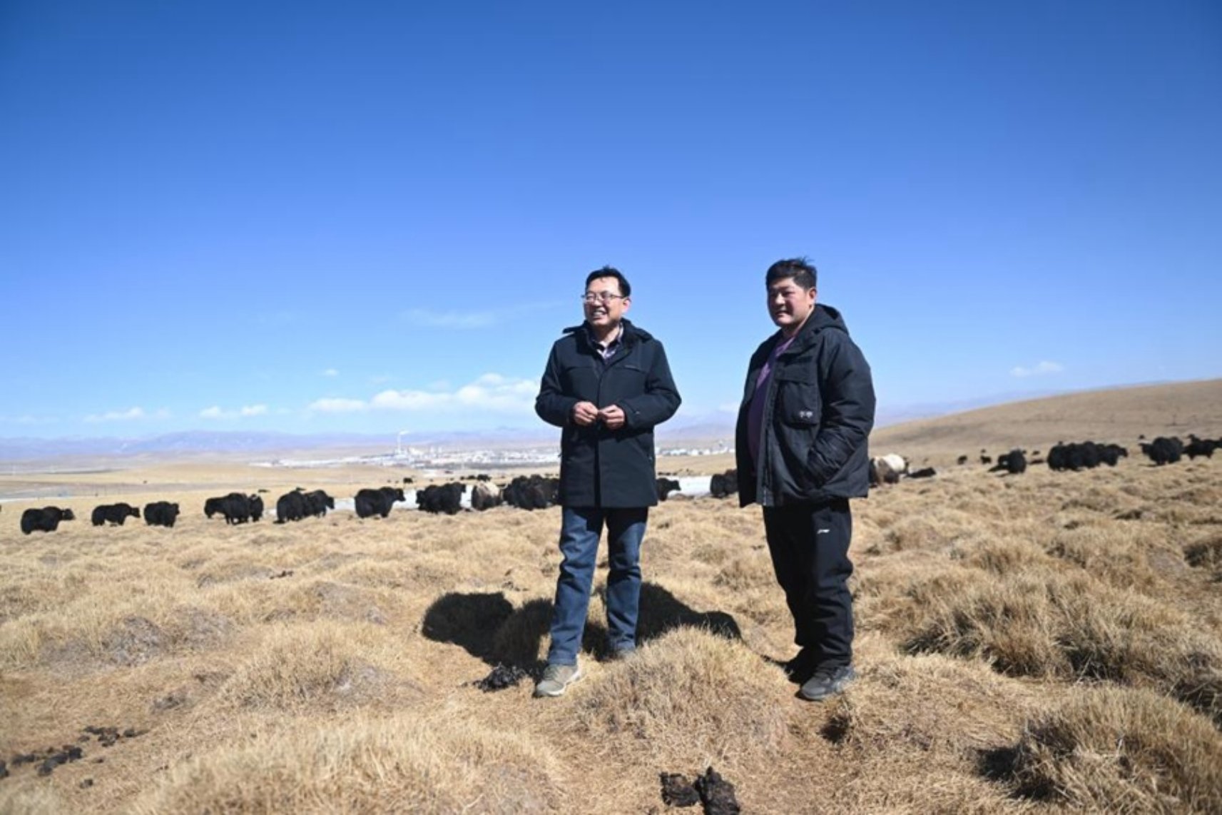 2023年2月24日,在青海省海北藏族自治州海晏县青海湖乡达玉日秀村,全国人大代表董全民(左)查看牧民东知布家的草场。新华社记者 张龙 摄