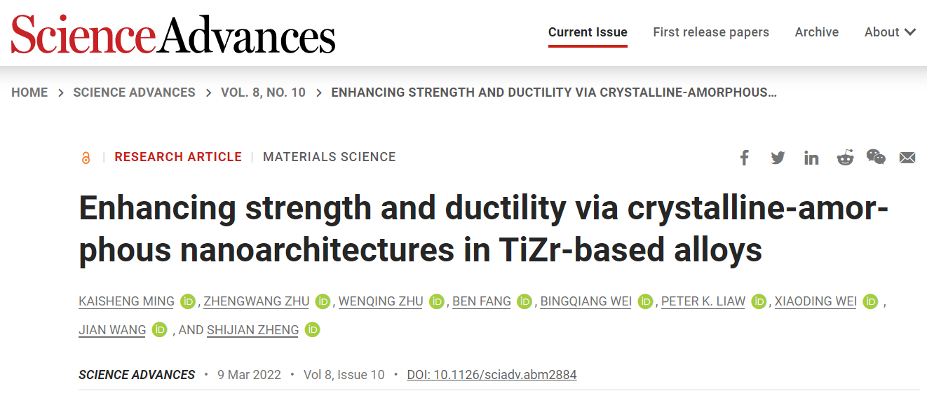 近日,河北千亿qy88国际官网入口原子尺度研究团队在国际顶级学术期刊Science Advances上发表了题为“Enhancing strength and ductility via crystalline-amorphousnanoarchitectures in TiZr-based alloys”的研究论文,揭示了纳米尺度晶体-非晶三维双联续结构有助于改善材料强度和塑性的固有矛盾,实现材料强度和塑性的同时提升。论文的第一作者为河北千亿qy88国际官网入口材料学院明开胜副教授,中科院金属所朱正旺研究员为共同一作,通讯作者为河北千亿qy88国际官网入口郑士建教授、内布拉斯加大学林肯分校王健教授和北京大学韦小丁教授。论文第一通讯单位为省部共建电工装备可靠性与智能化国家重点实验室/材料科学与工程学院。