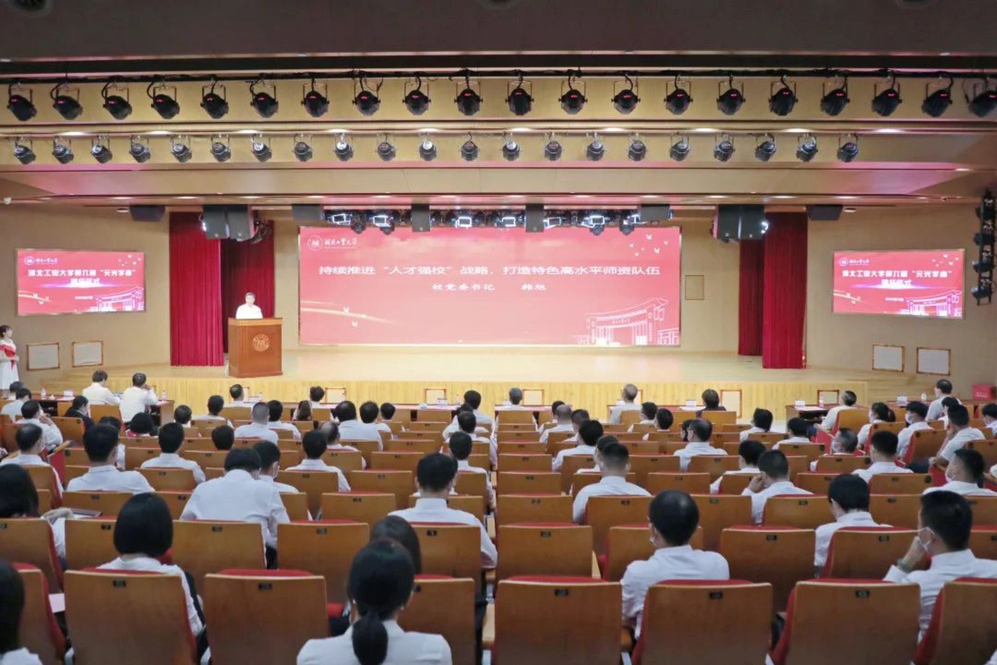 校党委书记韩旭发表讲话。他代表学校向各位受聘人员表示热烈的祝贺,并对大家为学校事业发展所付出的辛勤努力表示衷心的感谢。他回顾了学校“元光学者计划”实施的相关背景,总结了六年来的工作成效。自“元光学者计划”实施以来,学校人才队伍建设取得显著成效,高层次人才持续增加,师资队伍发展壮大,学缘结构得到进一步优化,人才引育效果显现,人才项目成果丰硕。近两年,学校增设了教学为主型的特聘岗C,进一步促进了教学与科研之间的良性循环。取得这些成绩的同时,学校将继续扎实推进师资队伍建设,引领校园风貌沿着重教学、重学术、重学风的轨道健康发展,学校“双一流”建设的高质量发展注入强劲动力。