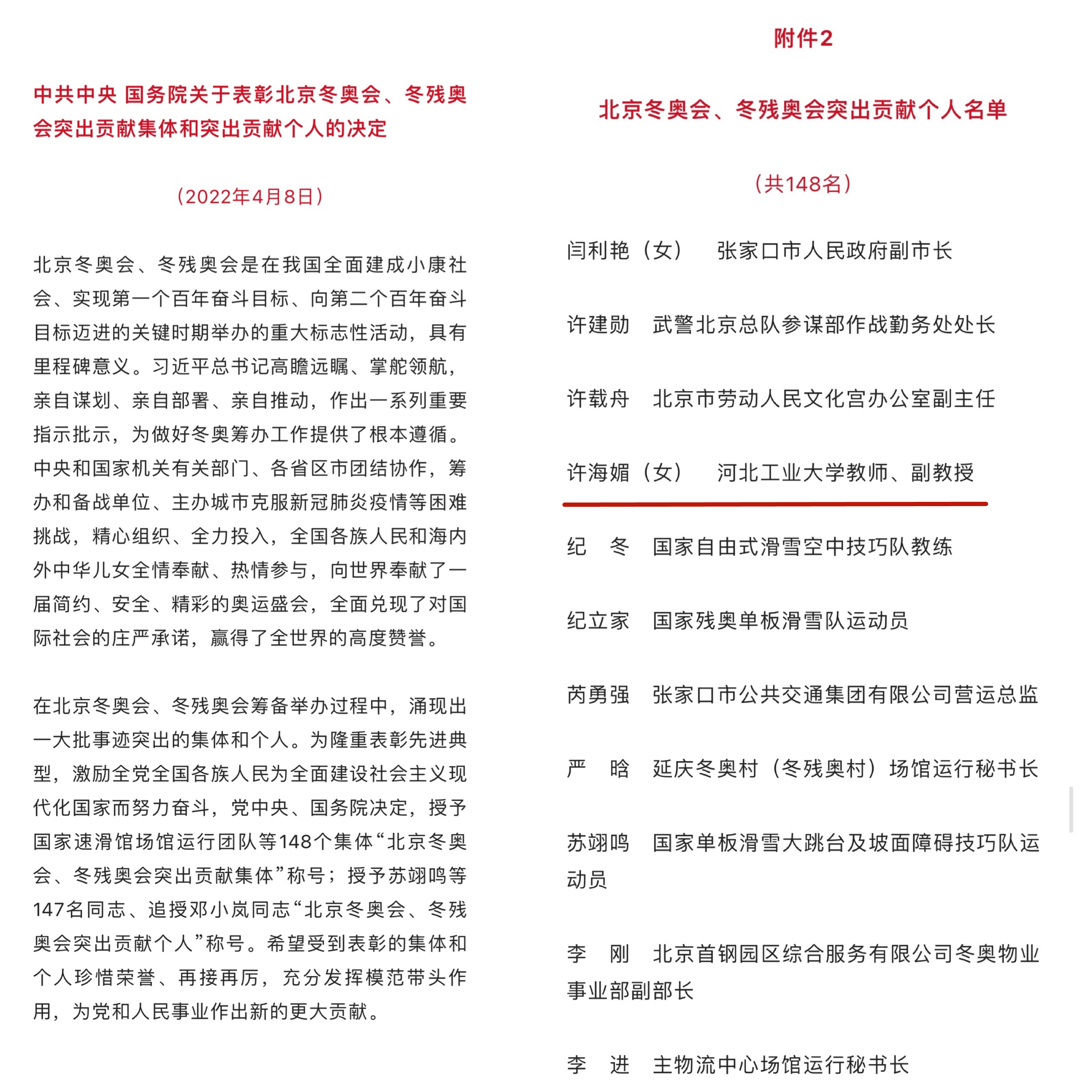 4月8日,北京冬奥会、冬残奥会总结表彰大会在京举行。148个集体、148名同志获得表彰。我校冬奥志愿者、材料科学与工程学院学工办主任兼团委书记许海媚被授予“北京冬奥会、冬残奥会突出贡献个人”称号。