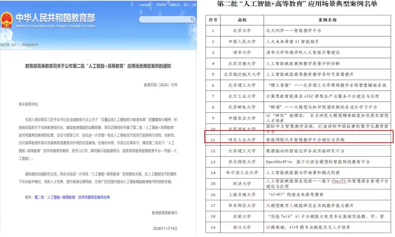 近日,教育部公布了第二批32个“人工智能+高等教育”应用场景典型案例,河北千亿qy88国际官网入口案例“智能网联汽车智慧教学平台建设与实践”榜上有名。