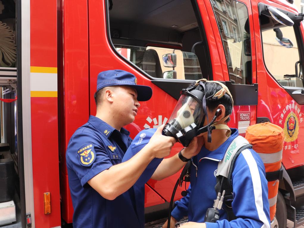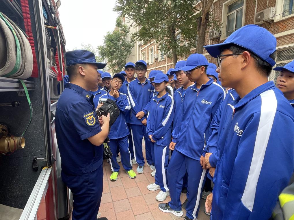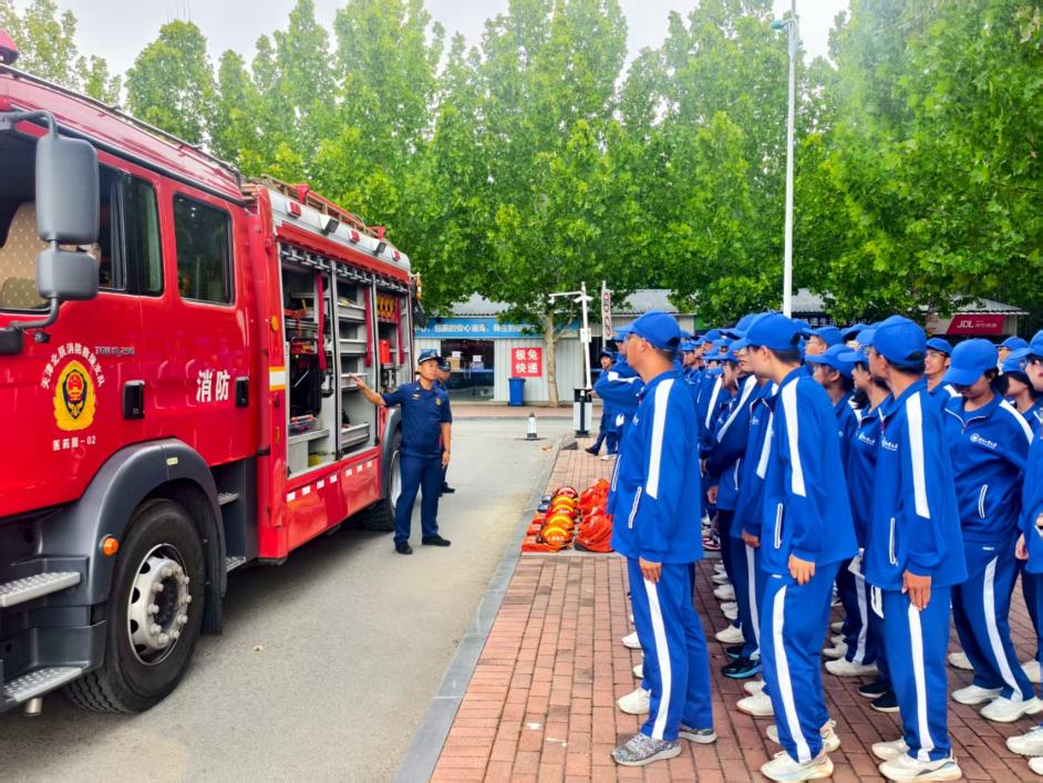 理论讲解结束后,新生们列队参与了消防装备体验环节。新生们有序来到消防装备展示区,近距离参观专业救援车辆。消防官兵打开车厢逐一介绍各类装备的功能用途,部分新生代表亲身参与装备体验,亲手触摸消防水带、破拆工具等专业器材,尝试佩戴过滤式综合防毒面具、穿戴灭火防护服,真切感受消防装备的专业性与实用性。