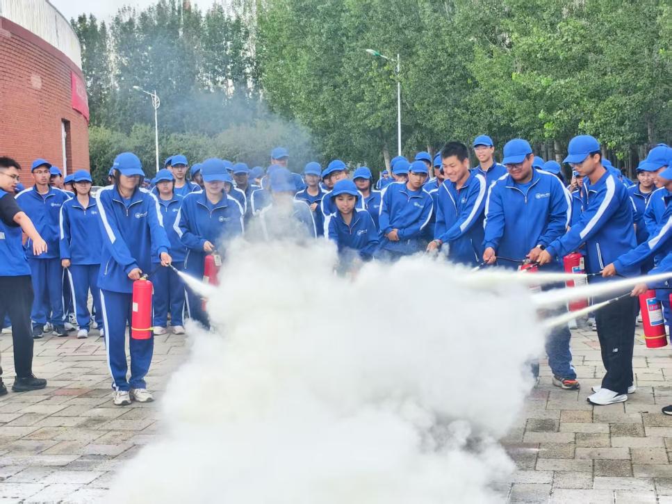 在消防工作人员的指导下,新生们分组列队,全员完成了二氧化碳/干粉灭火器的实操训练。大家严格按照“提、拔、握、压”的规范动作,精准对准火焰根部喷射,通过亲身实践,切实掌握灭火器的使用技能。